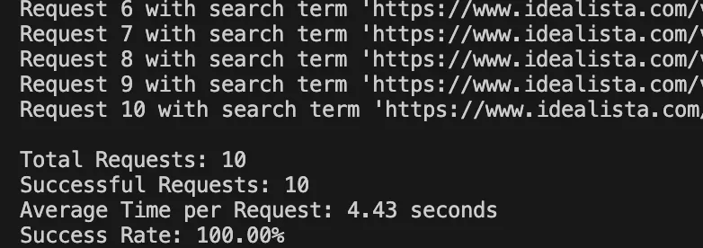 print(f"Request {i+1} with search term '{search_term}' took {request_time:.2f} seconds, Status: {response.status_code}")