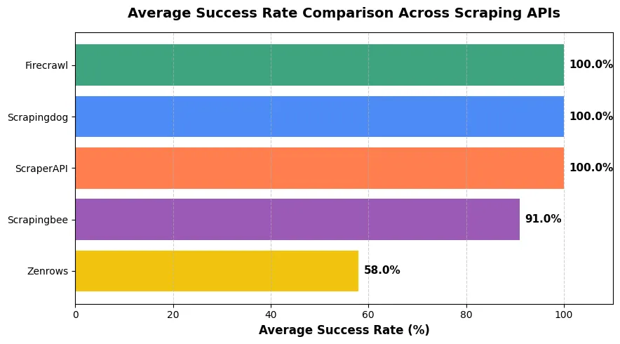 This graph is showing the overall success rate offered by each API. Clearly Scrapingdog, ScraperAPI and Firecrawl provides the best scraping solution.