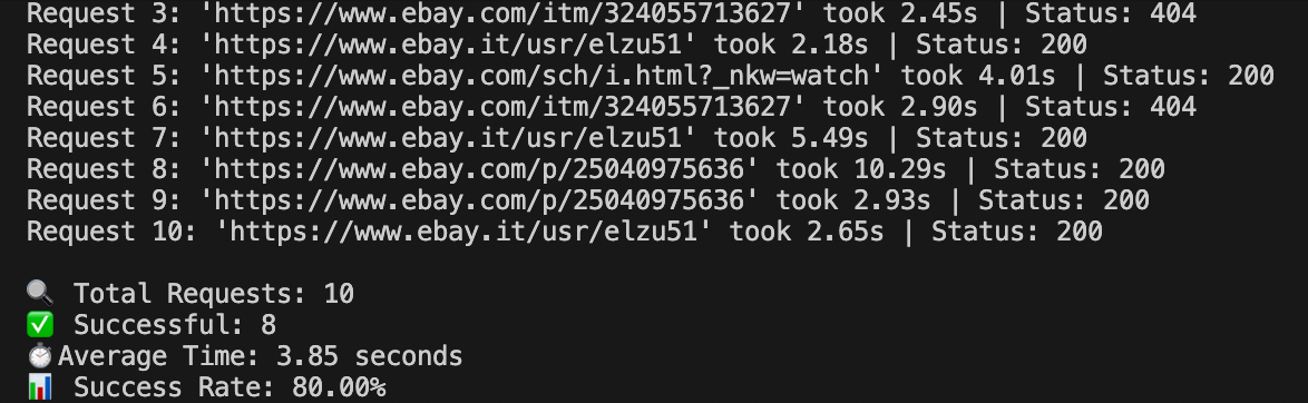 • While scraping eBay, we got a success rate of 80% with an average response time of 3.85 seconds.