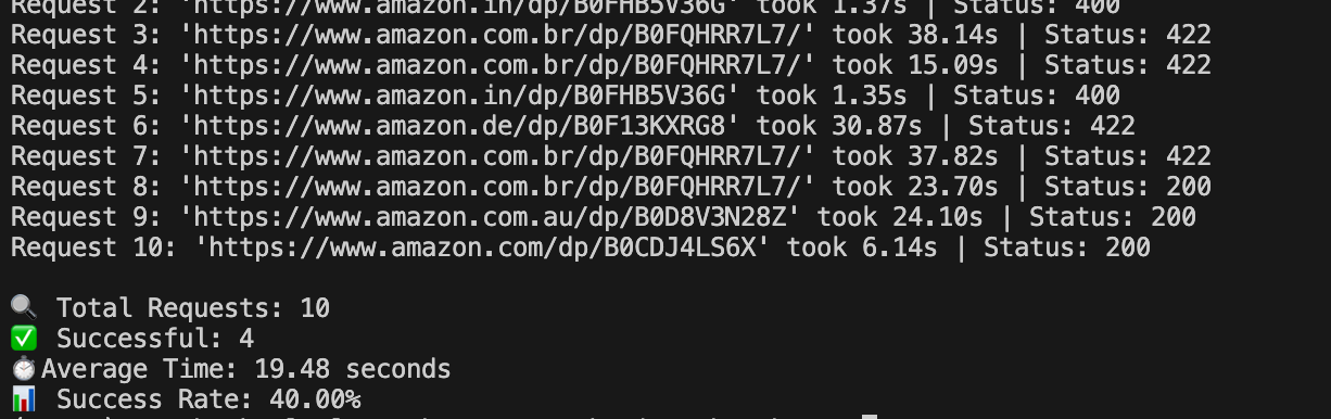 • ZenRows achieved a 40% success rate on Amazon, with an average response time of 19.48 seconds.