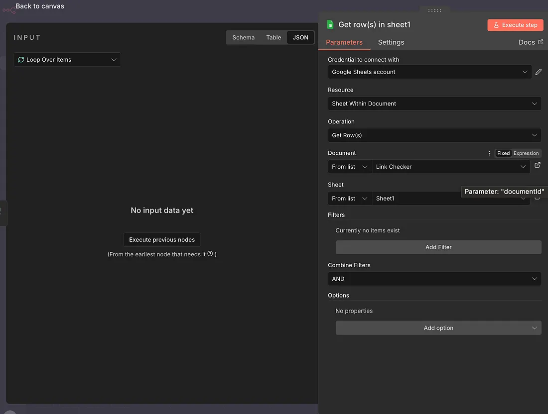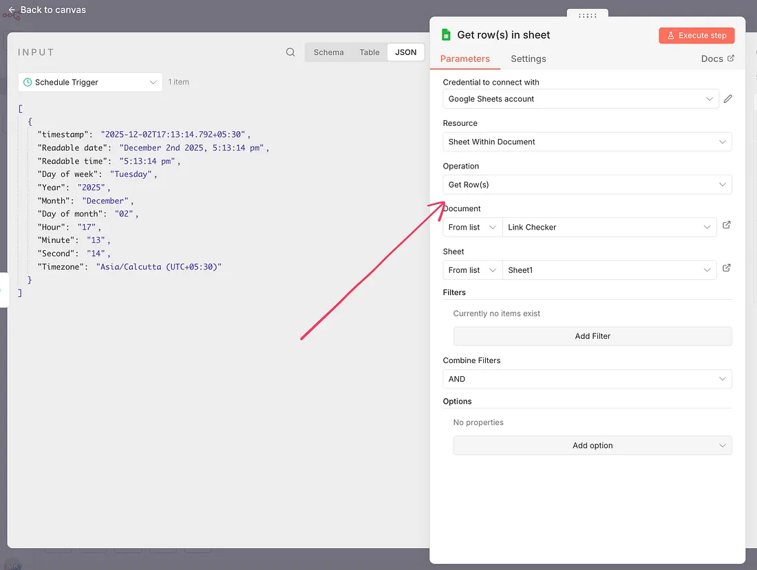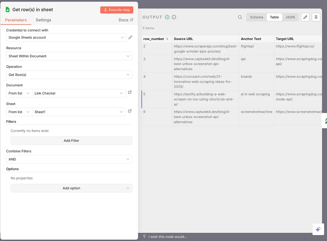 My next node will pick the data from these fields; the operation is ‘Get Rows.’ Map it to the right spreadsheet name, with the right tab & there is no filter applied, since we want to check all the links every time our workflow runs.