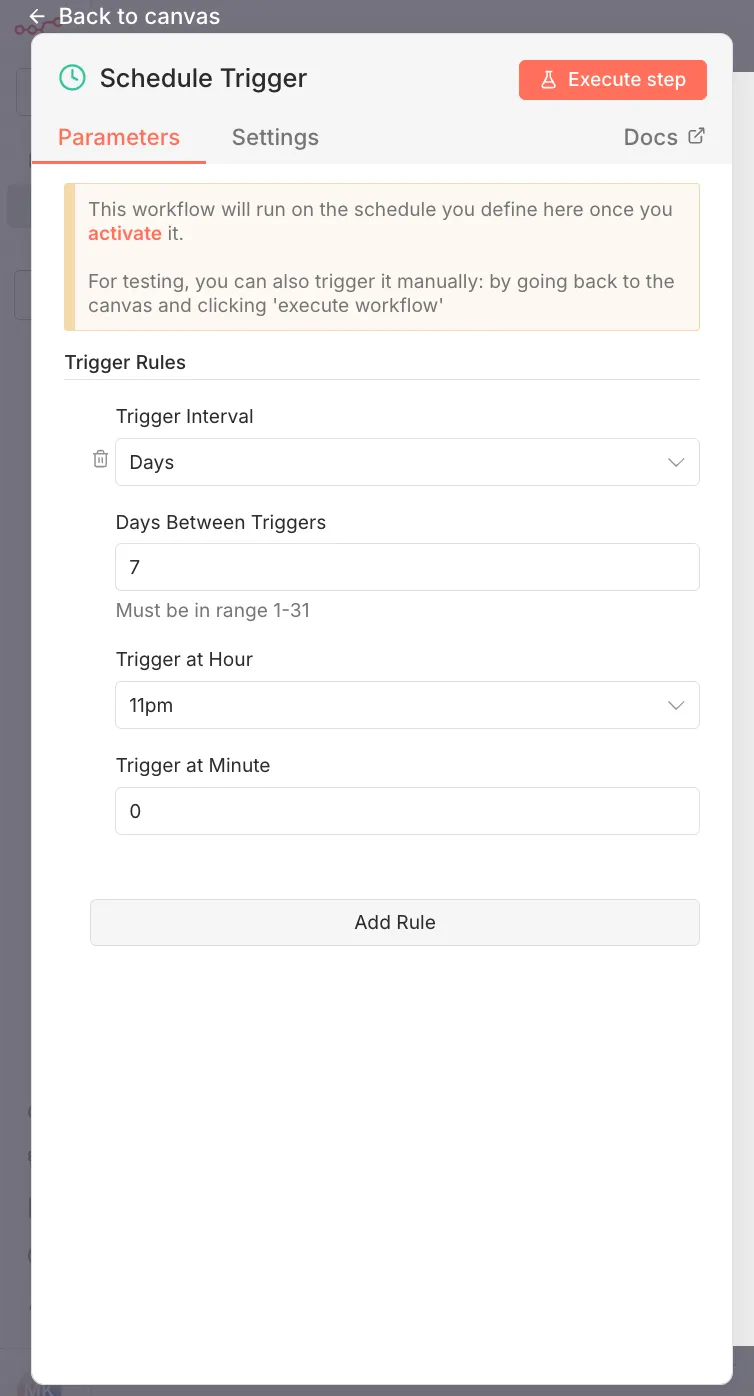 We are using “Schedule Trigger” that is scheduled to run once per week. You can set this time according to you.