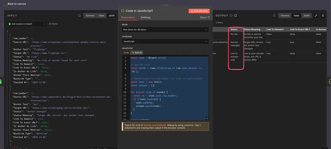 Now there is a code node, with JavaScript code, that will take all the rows that have a status other than OK.