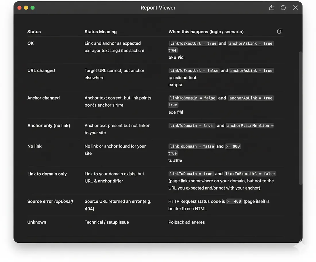 So a status is OK when your anchor and target url match, but if any of them don’t, the Status is different.
