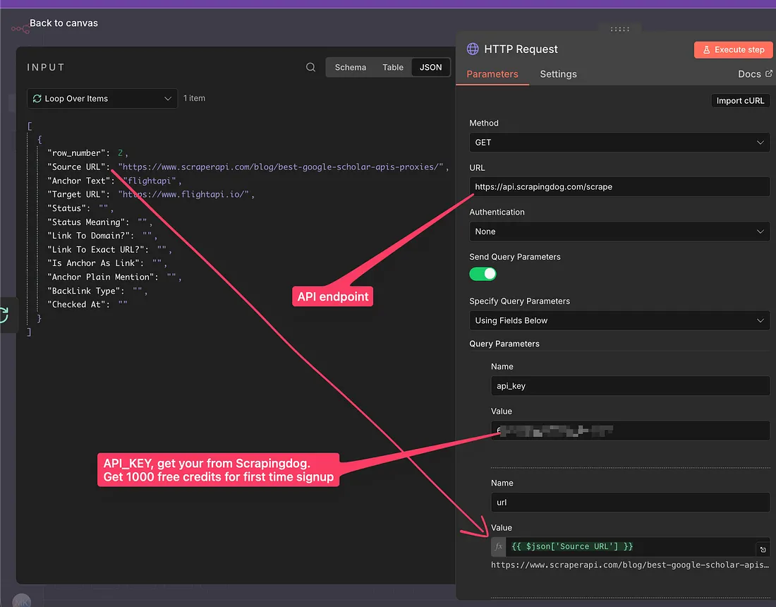 Download this blueprint on your machine and import it into your n8n canvas. Further, you need Scrapingdog’s API_KEY, which you can get by signing up for free in your dashboard.
