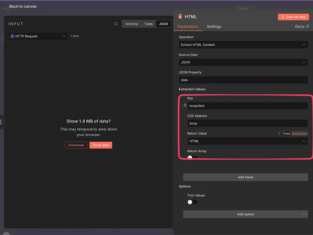 So all the links that you will build will be in the body of the content & this makes sense as these will be the links that will profit you. Hence, we will not use all the HTML, rather the body of the HTML & this is what we will do in the next node.