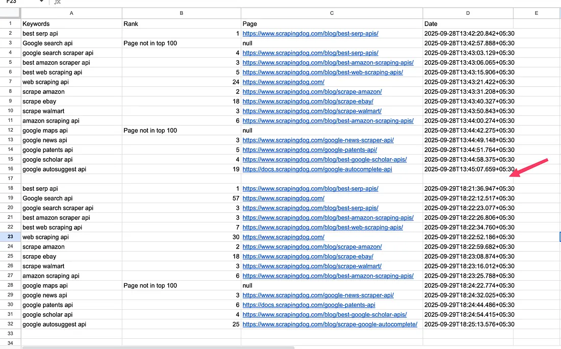 After increasing the page number, we pass this to our Scrapingdog’s API and collect the next 10 results, then find if these results have our page in there. If it is there, we append to Google Sheets; if not, we call the next page.