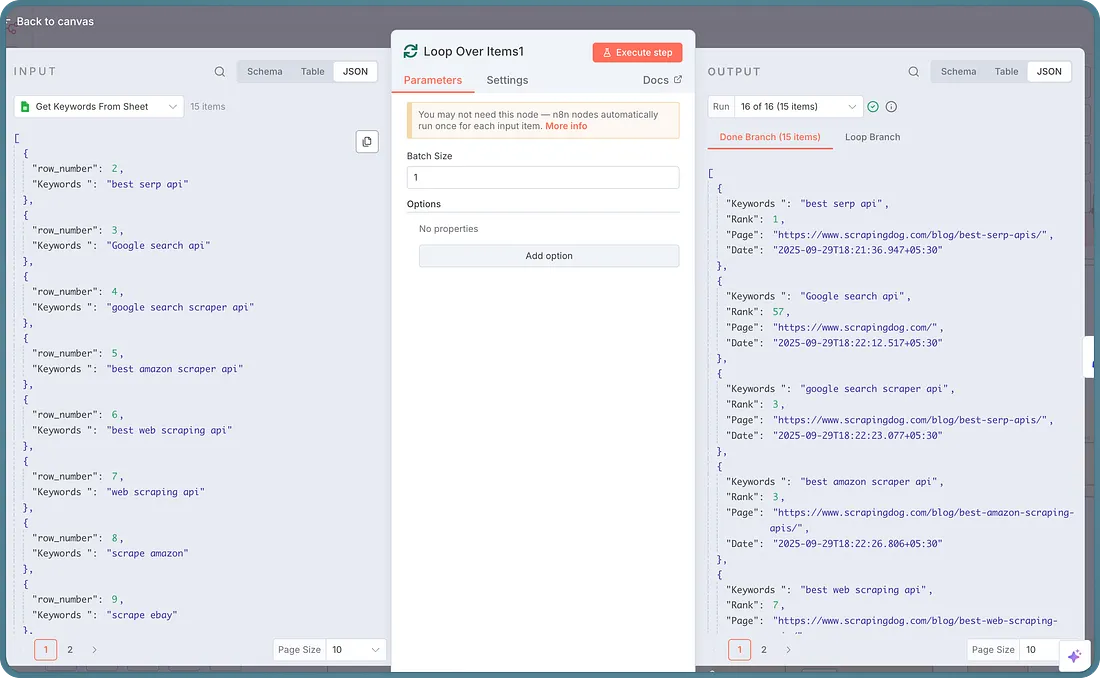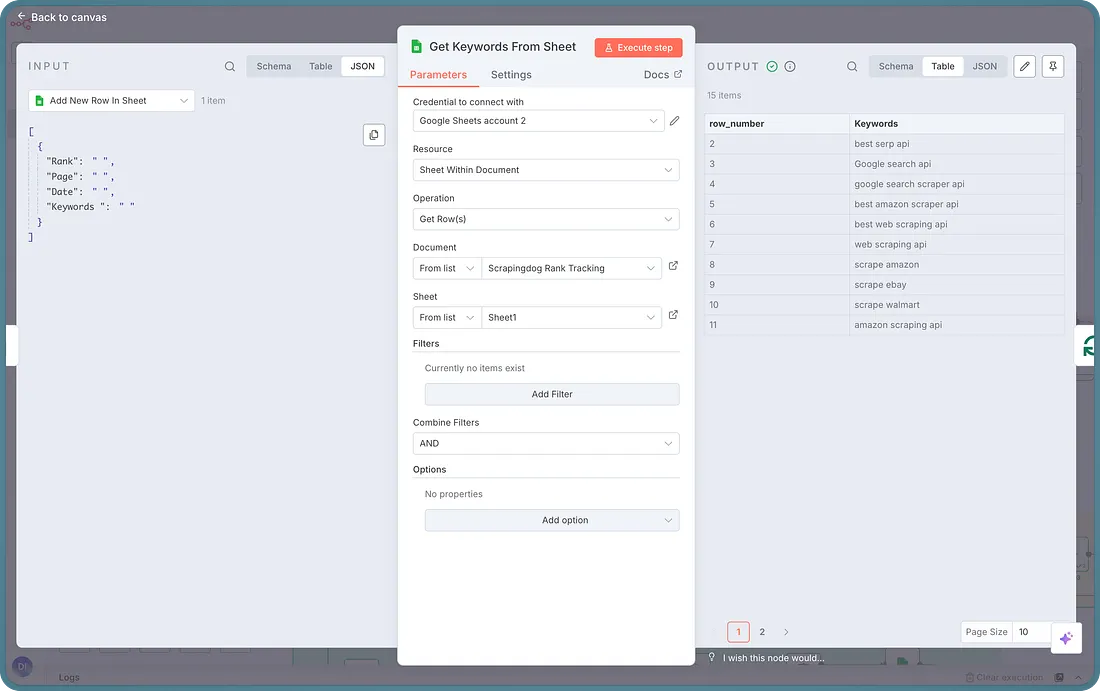 The Idea was to create a basic rank tracker that is optimized for cost as well as efficiency. We are not scraping all 10 pages upfront, i.e., if the keyword is found on page 1, the workflow automatically takes the second keyword and gets results for the next keyword.