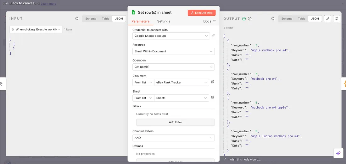 Now the next node will be to take data from our spreadsheet, therefore the Google Sheets node will be used & we will take keywords from there.