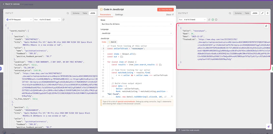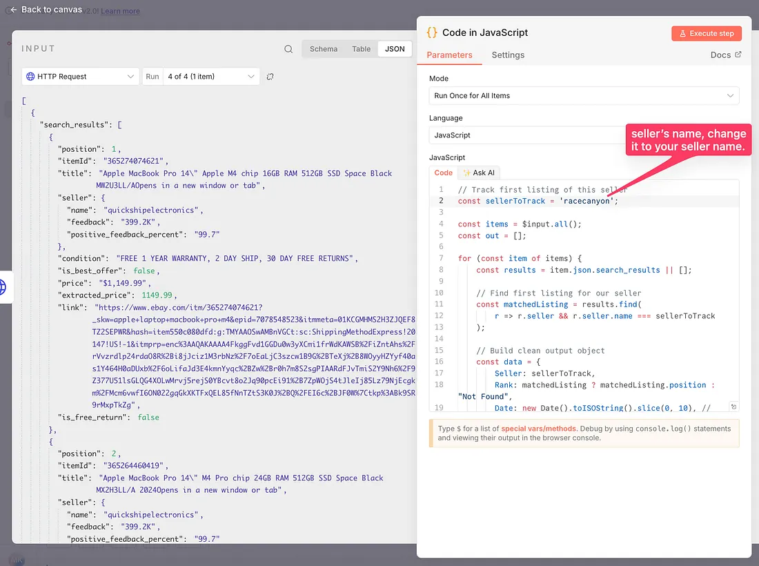 In the next node, we will again use a code node, which will help us to take out the rankings. The field we are using to differentiate our listing from other listings is the ‘seller’s name’.