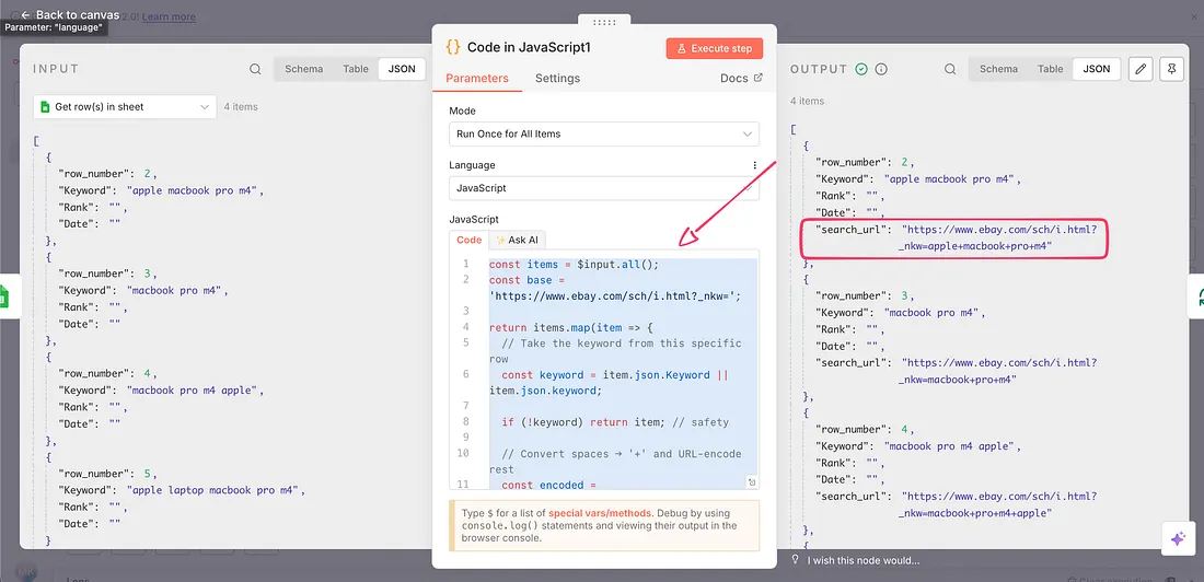 This pattern remains the same, and therefore, instead of using the URL of eBay, we are building one using our keywords, and for that, we are using the code node.