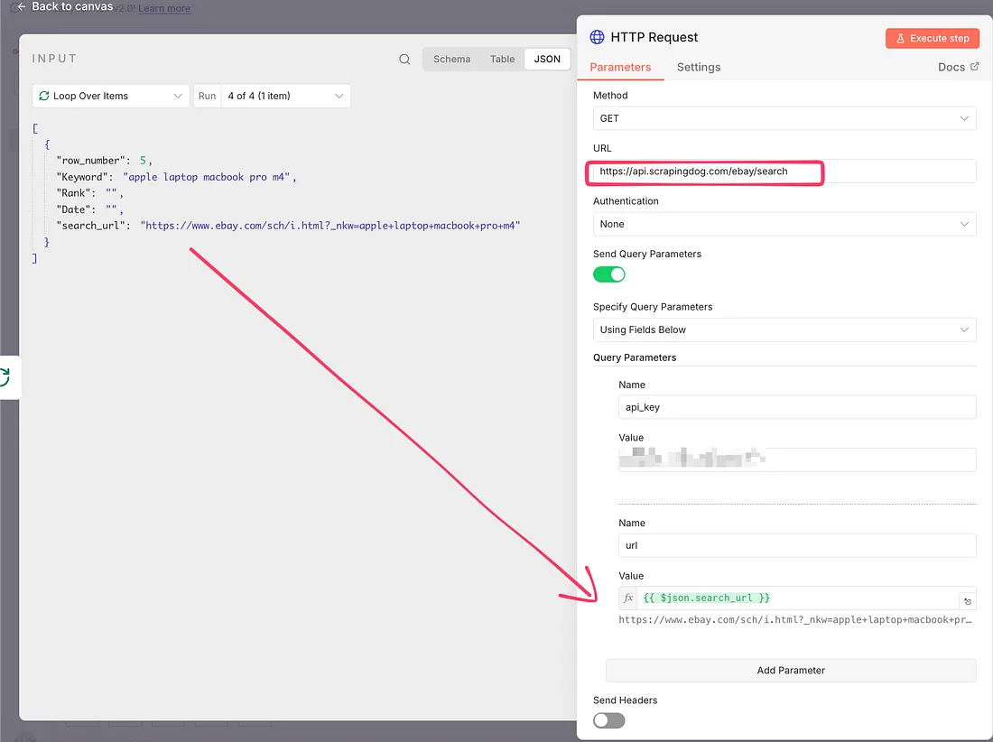 Therefore, the next node is a loop node in our workflow, and after that, we have an HTTP node as discussed earlier to scrape search results from eBay.