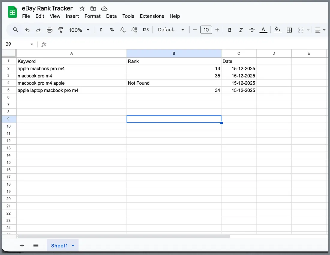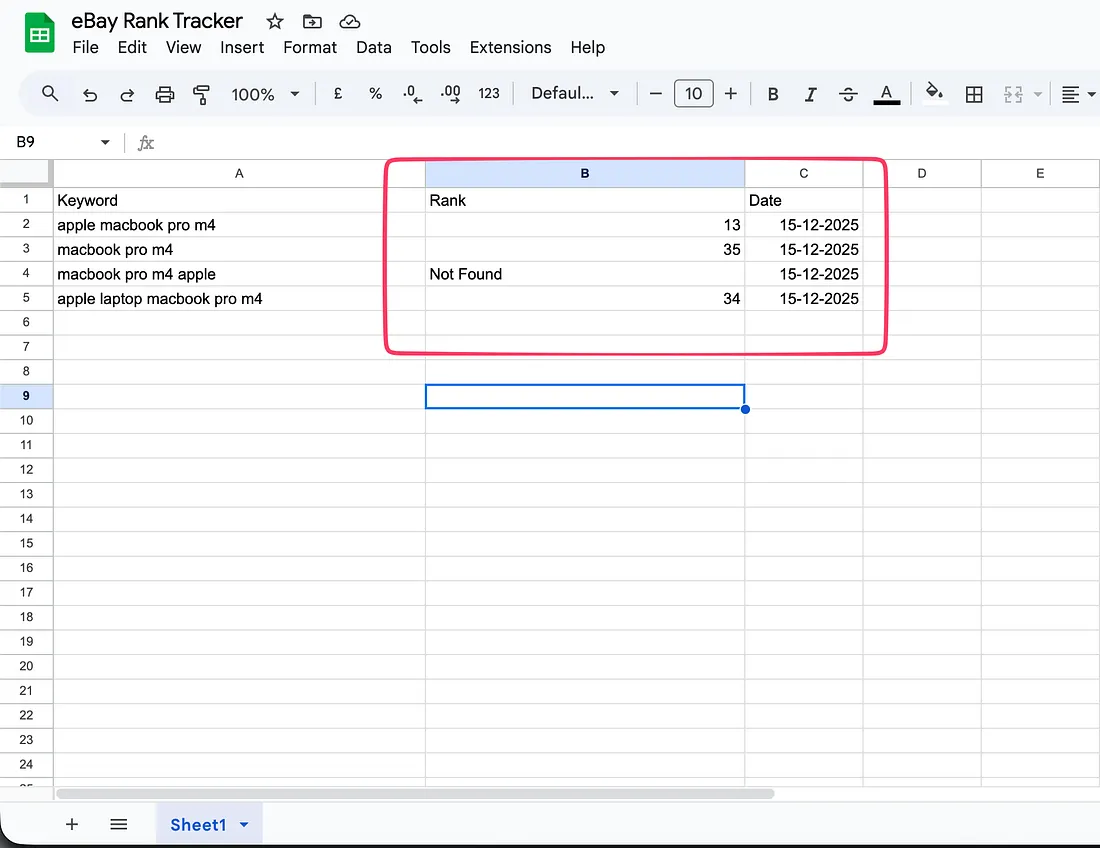 And when the whole automation runs, I have the rank data in my spreadsheet like this.