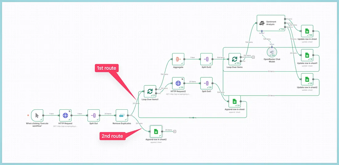 There are now 2 paths in our workflow, one will collect reviews, and the other will note down all the businesses that we have extracted. See the image below to understand this.