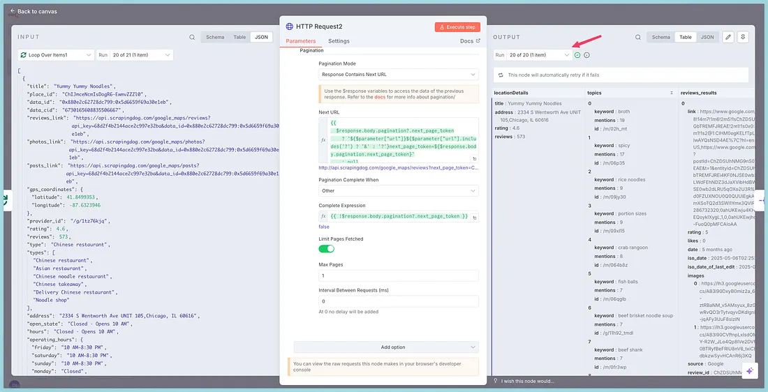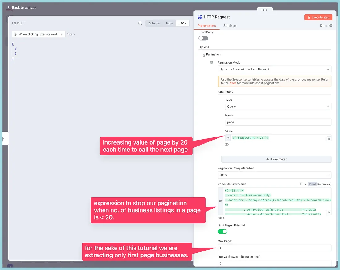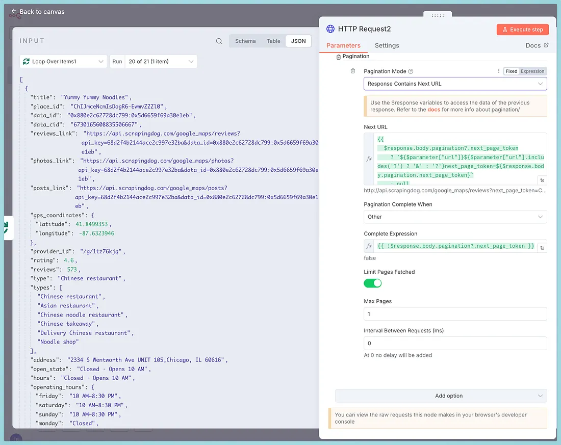 Since there can be ‘n’ no. of businesses in an area, we can use pagination in n8n.