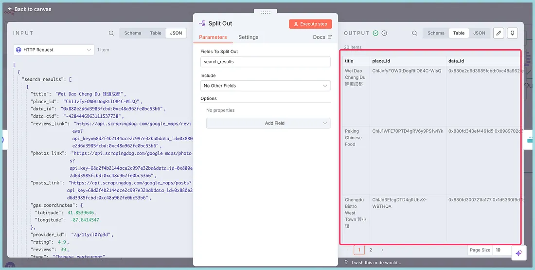 Since these results are in an array, we are now separating them each using a split-out node.