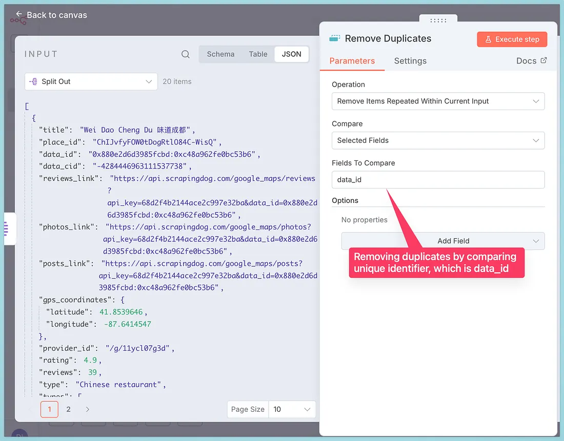 After this node, you will get a clean list of unique businesses. We will take these businesses into our CRM, which is Google Sheets.