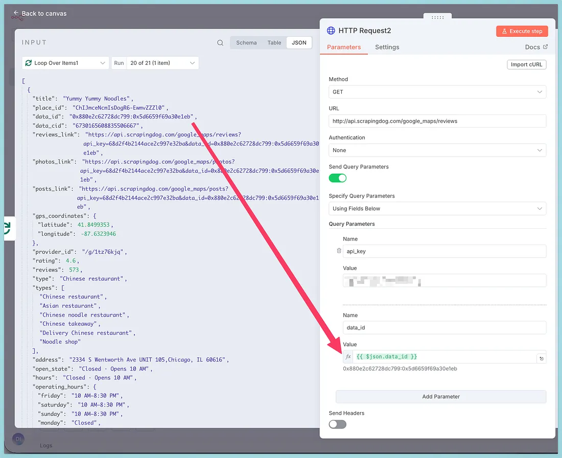 The loop node next, as you can see in our workflow, helps us to take businesses’ data_id one by one & pass them to our Google Maps reviews API.